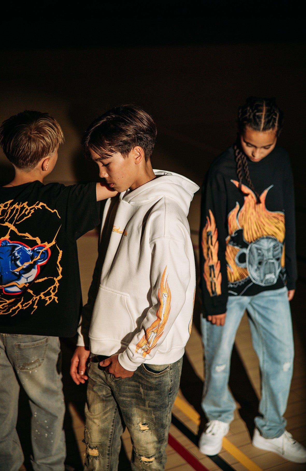 Black Bananas Kids präsentiert Team Blaze vs Team Electro, eine Kollektion, die Feuer und Blitz in dein Style-Spiel bringt. Zwei Hoodies, ein Longsleeve und ein T-Shirt. Jedes Teil ist aufgeladen mit fetten grafischen Prints, lodernden Flammen für die Hitzesuchenden und elektrisierenden Linien für die Powerplayer. Bringe die Hitze mit Team Blaze oder schlage schnell zu mit Team Electro.