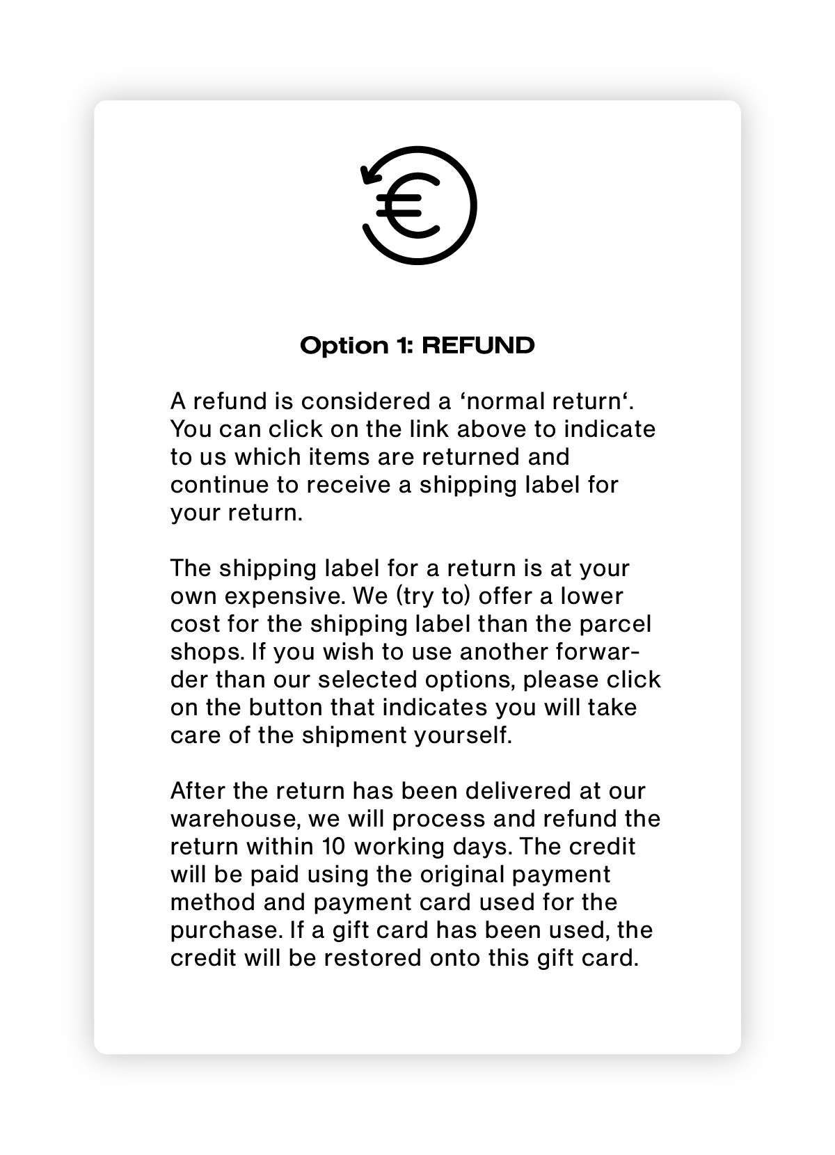 Sobald unser Vertriebszentrum Ihre Rücksendung erhalten hat, erhalten Du innerhalb von 10 Arbeitstagen eine Rückerstattung oder eine berichtigte Klarna Rechnung.