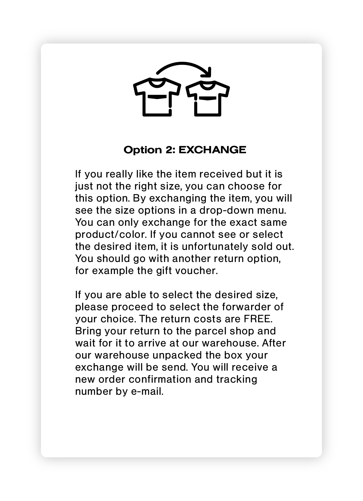 Der Umtausch gegen eine andere Größe ist für jedes Land kostenlos. Du erhältst ein vorausbezahltes Rücksendeetikett.